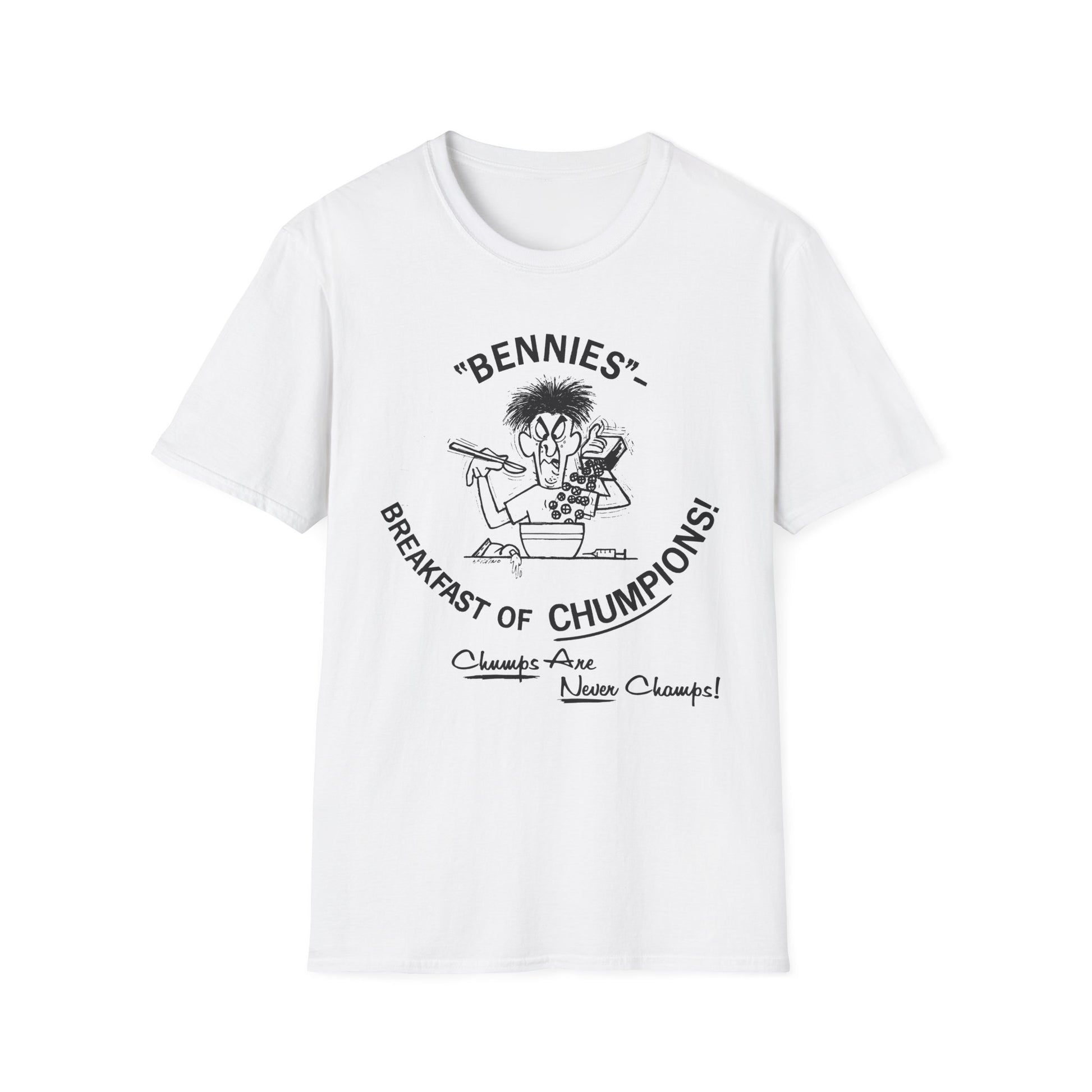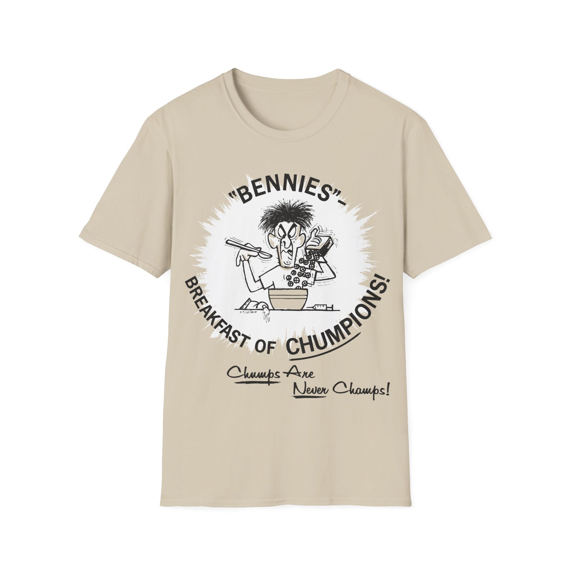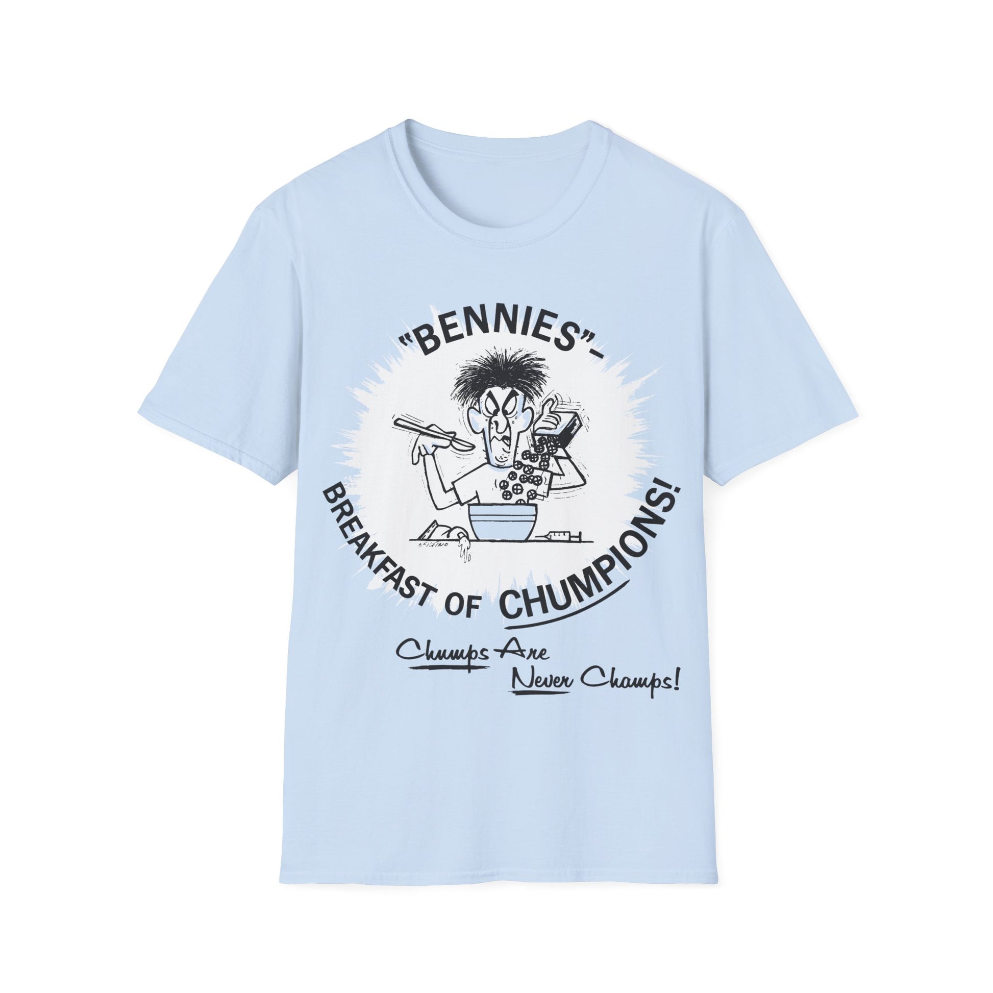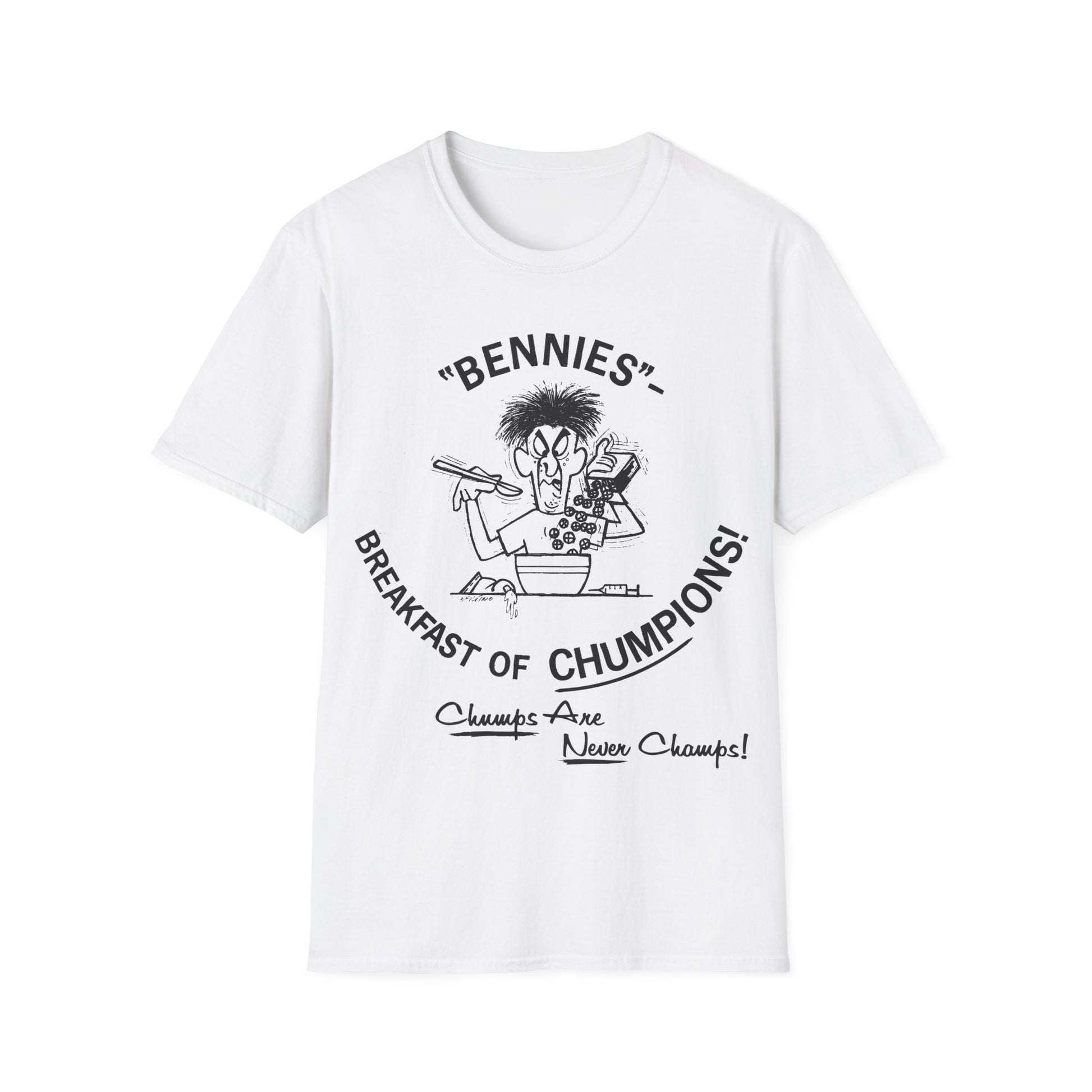 1960s/70s anti-drug poster tshirt "bennies - breakfast of chumpions! chumps are never champs!" by smartset smarteen s.o.s tshirt