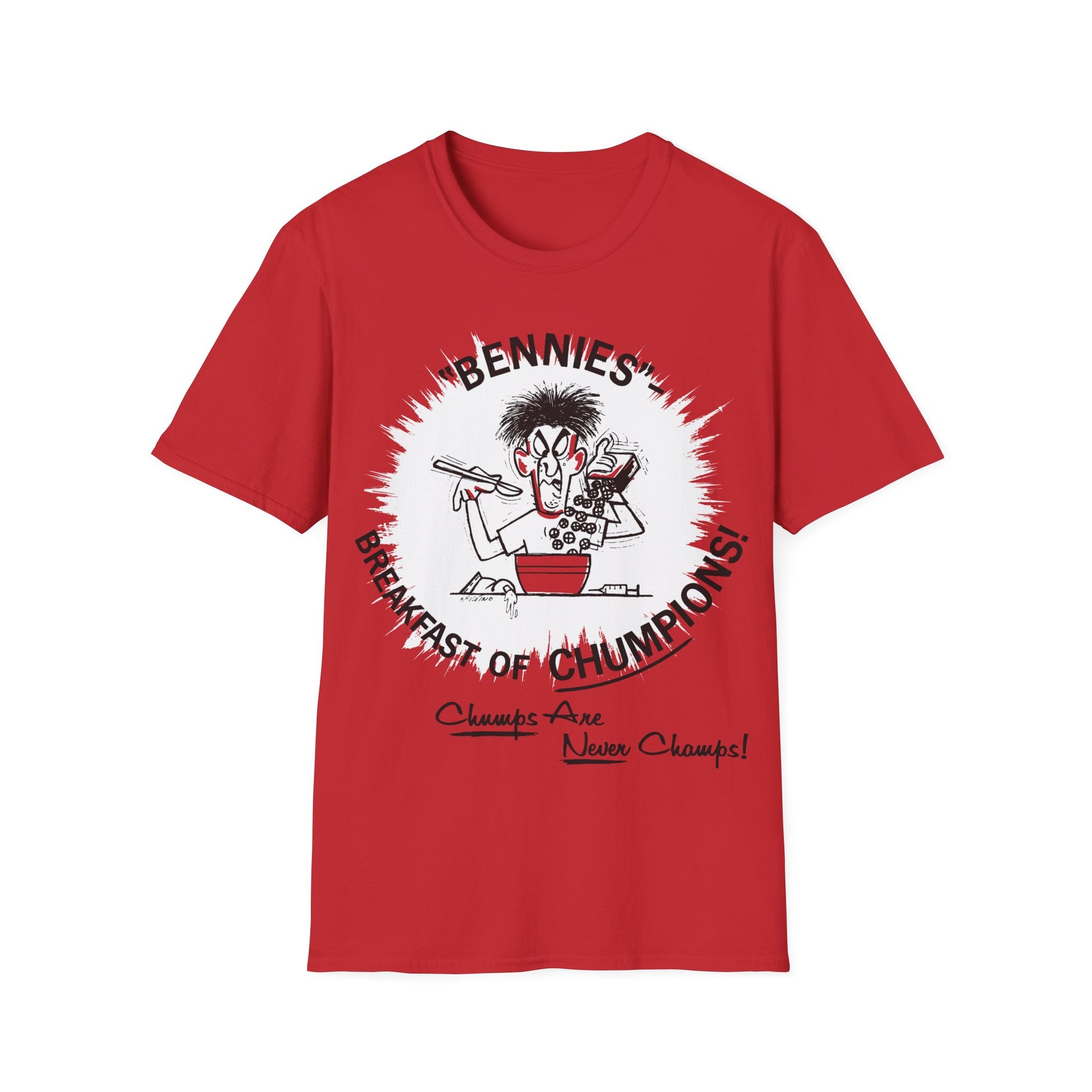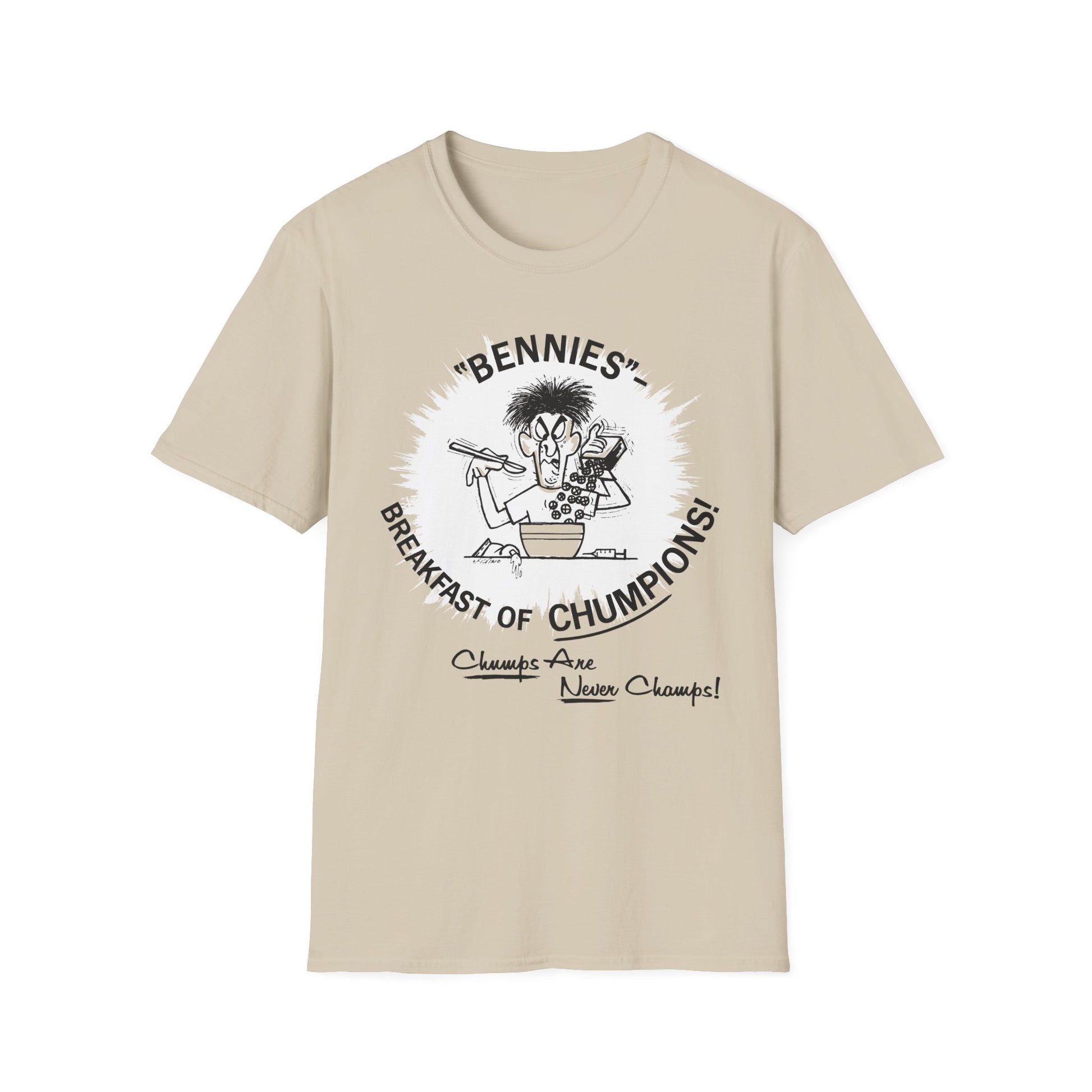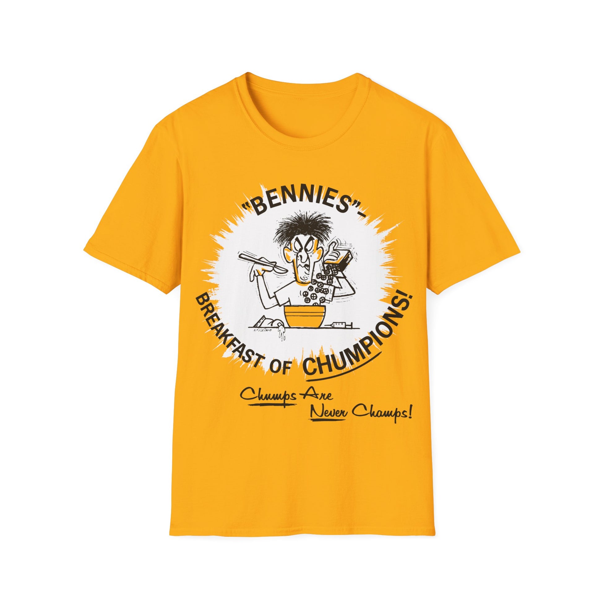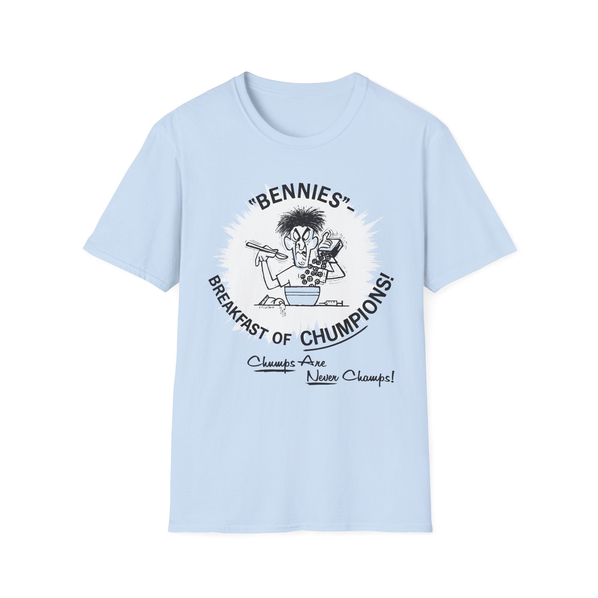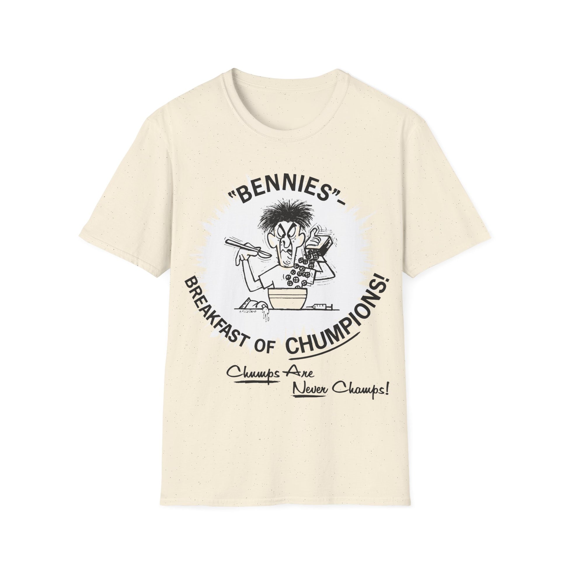 1960s/70s anti-drug poster tshirt "bennies - breakfast of chumpions! chumps are never champs!" by smartset smarteen s.o.s tshirt