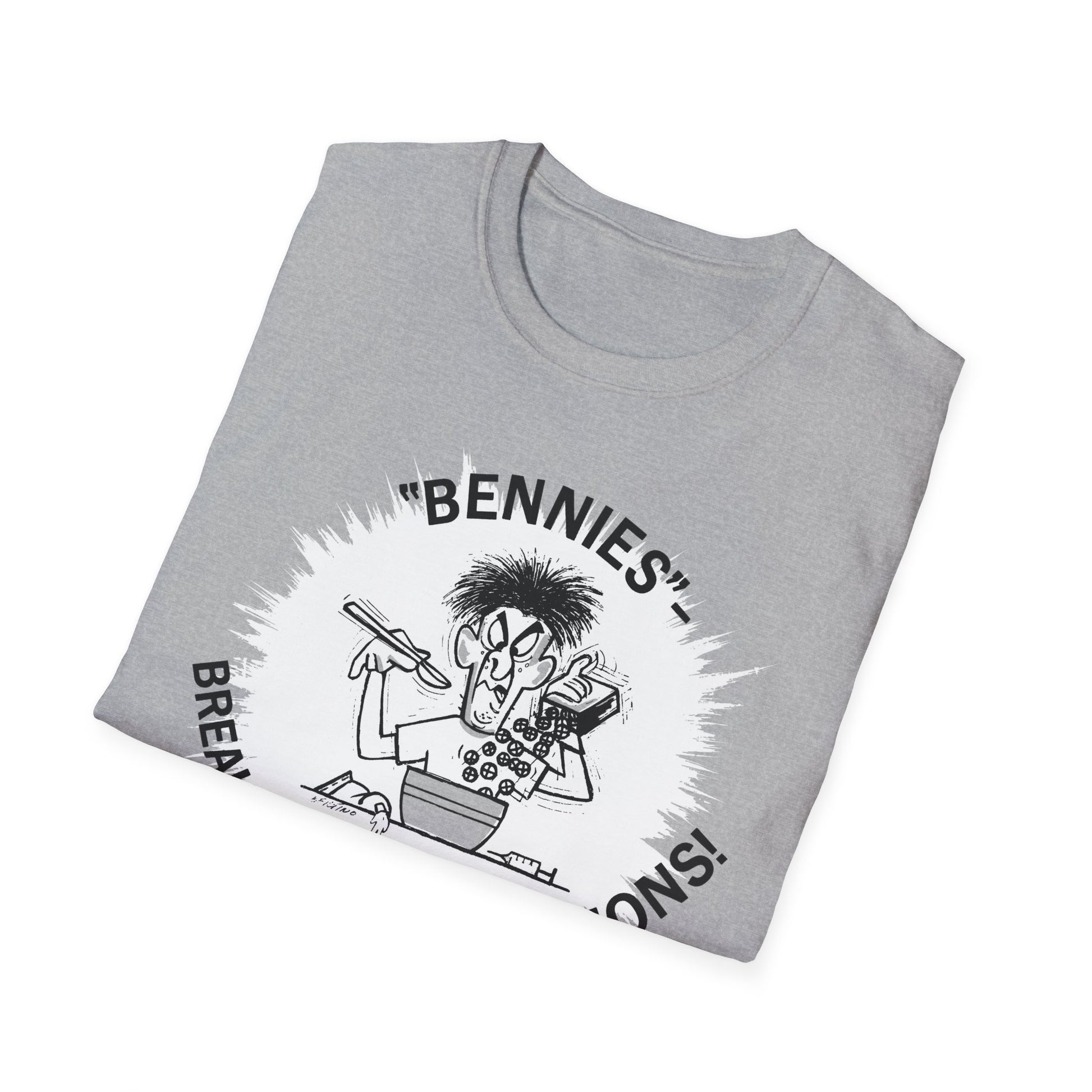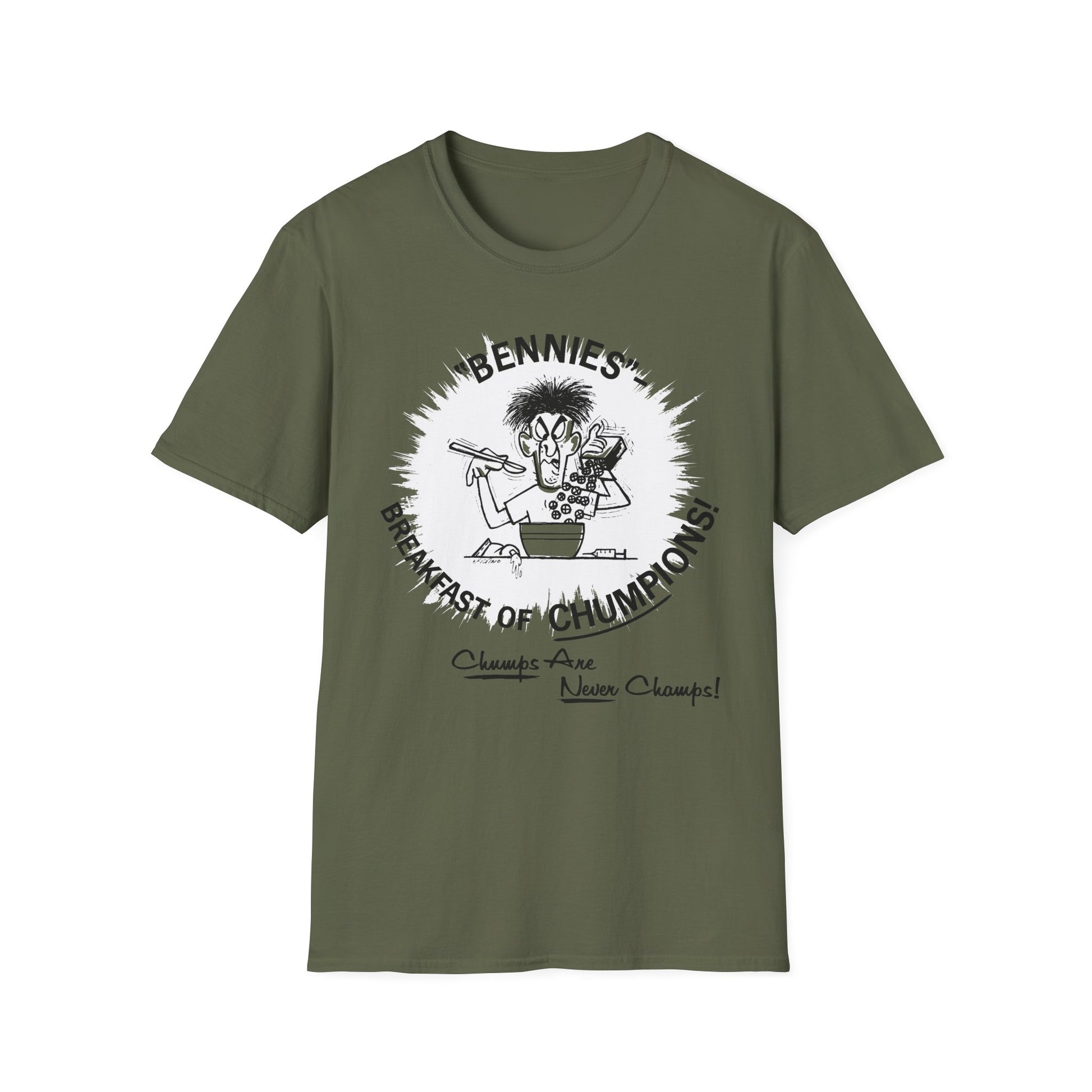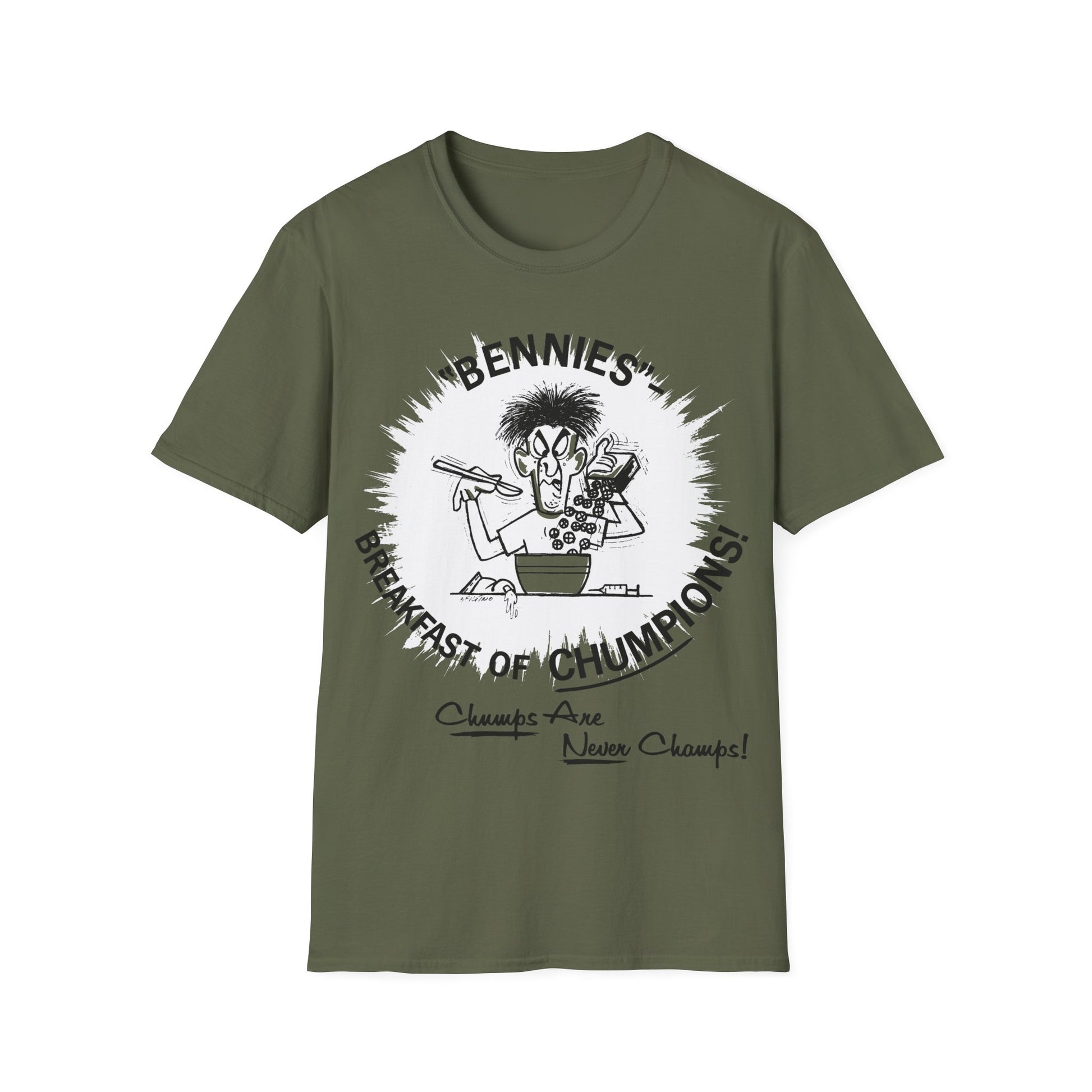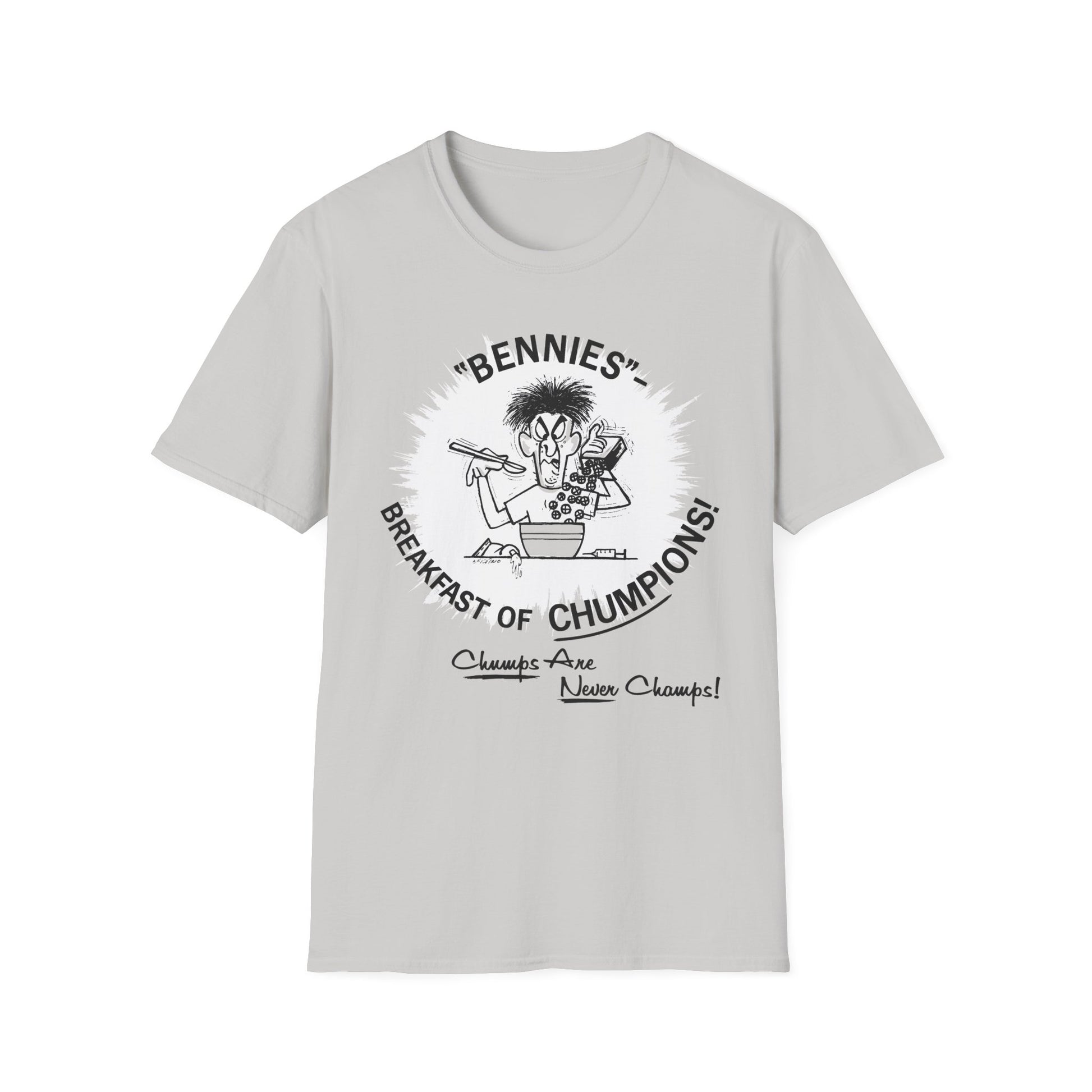 1960s/70s anti-drug poster tshirt "bennies - breakfast of chumpions! chumps are never champs!" by smartset smarteen s.o.s tshirt