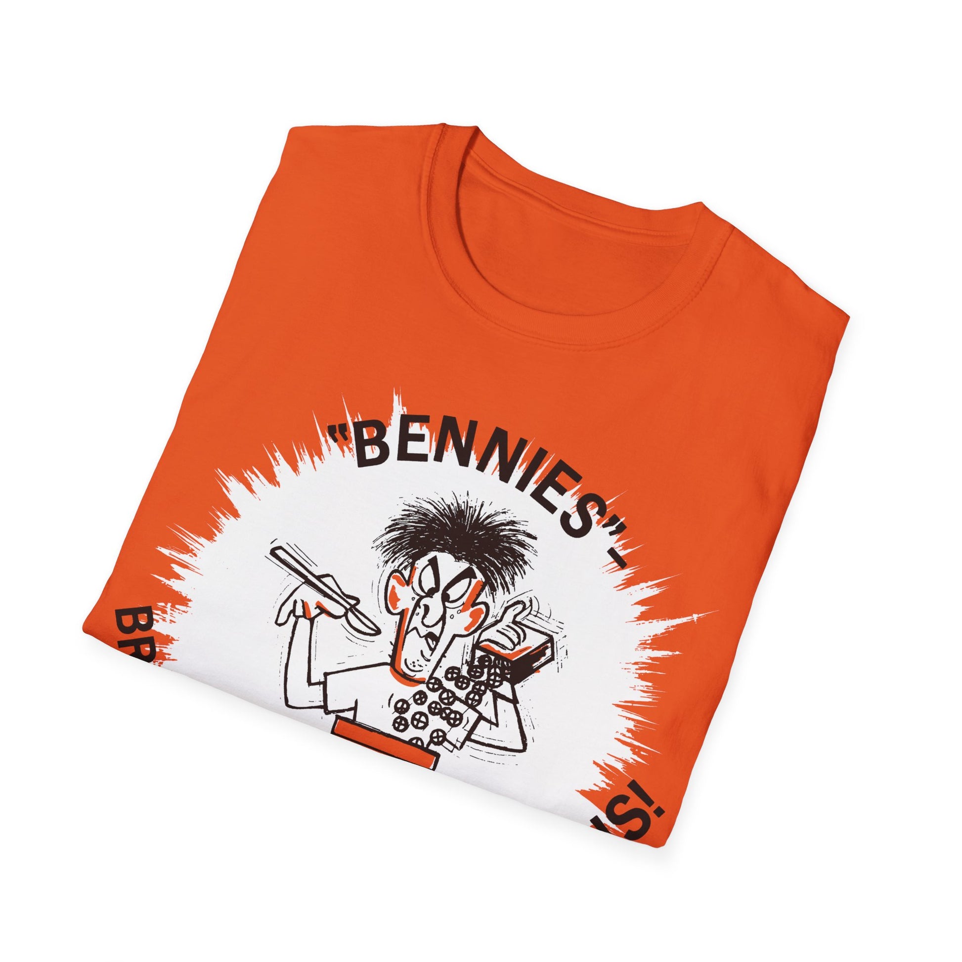 1960s/70s anti-drug poster tshirt "bennies - breakfast of chumpions! chumps are never champs!" by smartset smarteen s.o.s on a tshirt "Published around the time of Nixon’s declaration of the war on drugs, this poster was produced by Smart Set International, a student and teen-led organisation that aimed to promote an anti-drug message from a teenage perspective. To that end, the “Smarteens” (as they became known) formed groups that pledged never to use drugs and adopted the motto “SOS - Stamp Out Stupidity”, though in this poster the motto seems to have evolved into “Speak Out Sensibly”. Smart Set published thousands of posters with dozens of unique designs between 1967 and 1972 targeting marijuana, LSD, heroin and even cigarettes and alcohol."