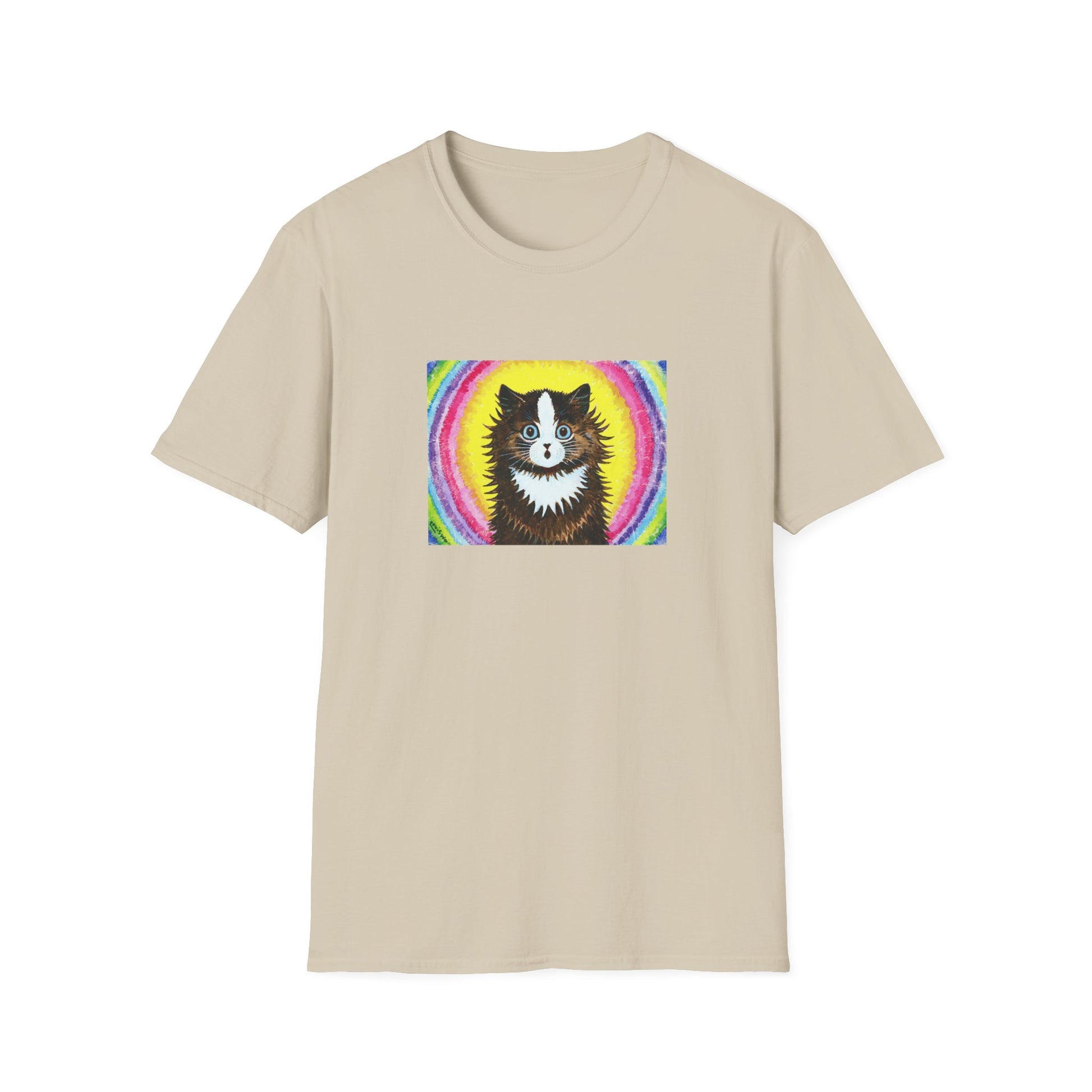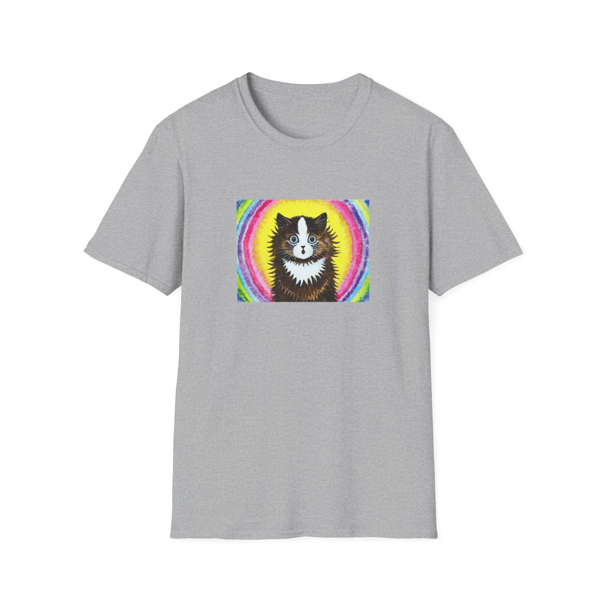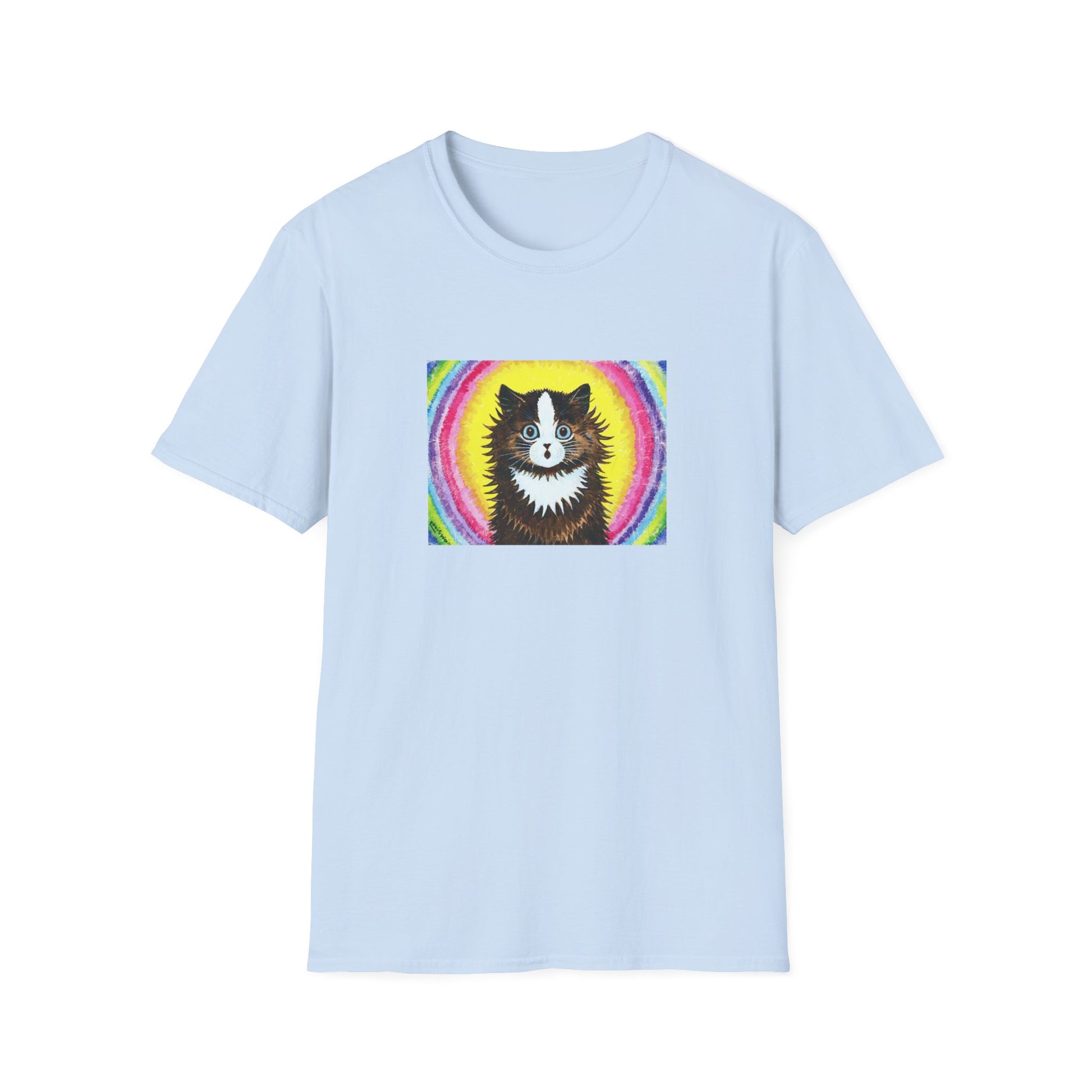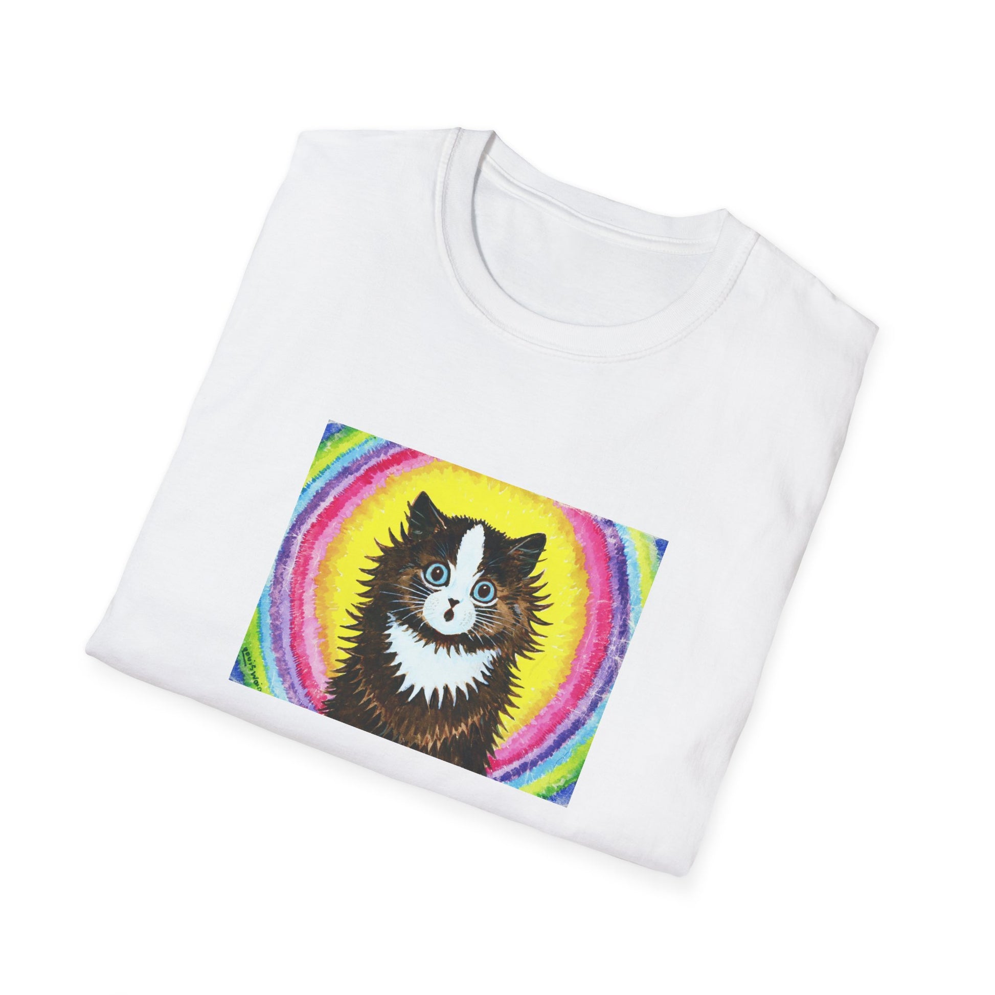 louis wain cat in a rainbow watercolour and gouache on paper reproduction tshirt