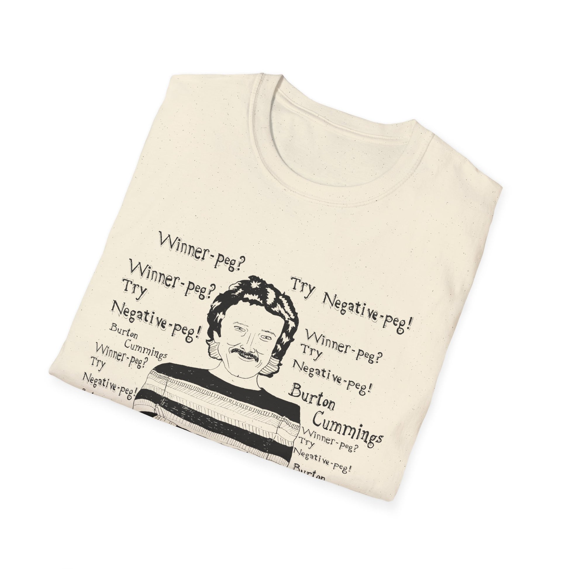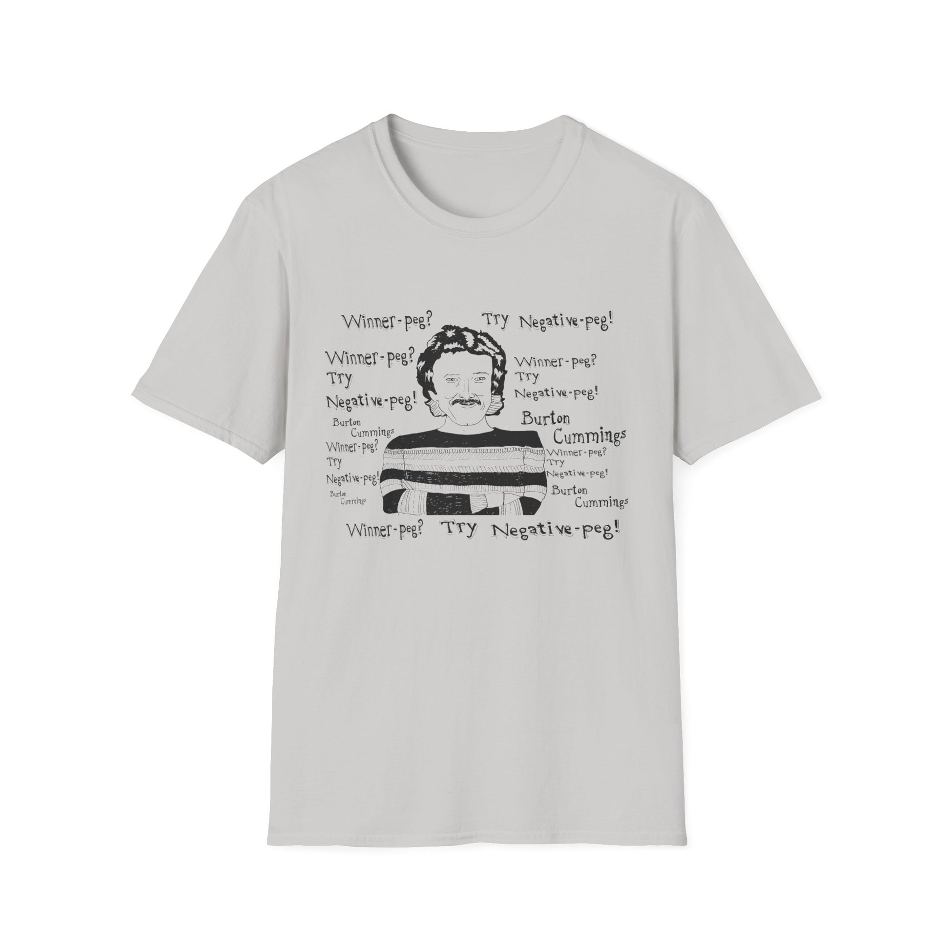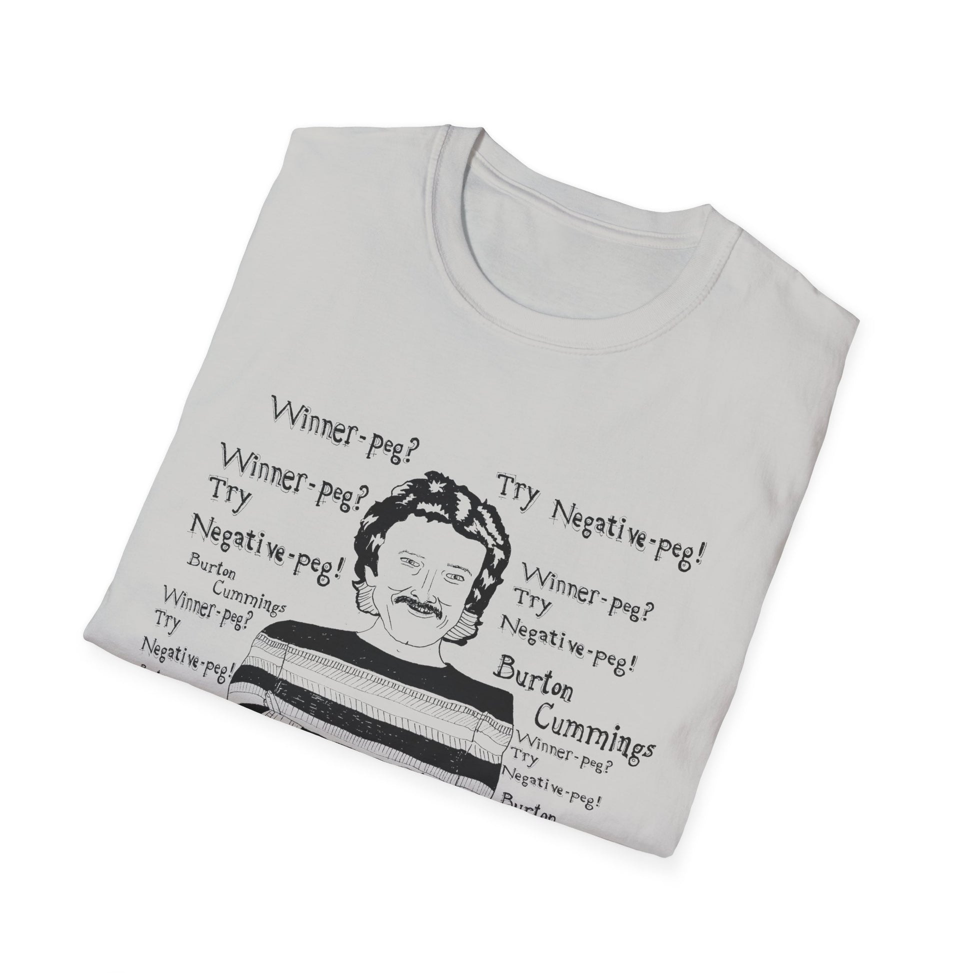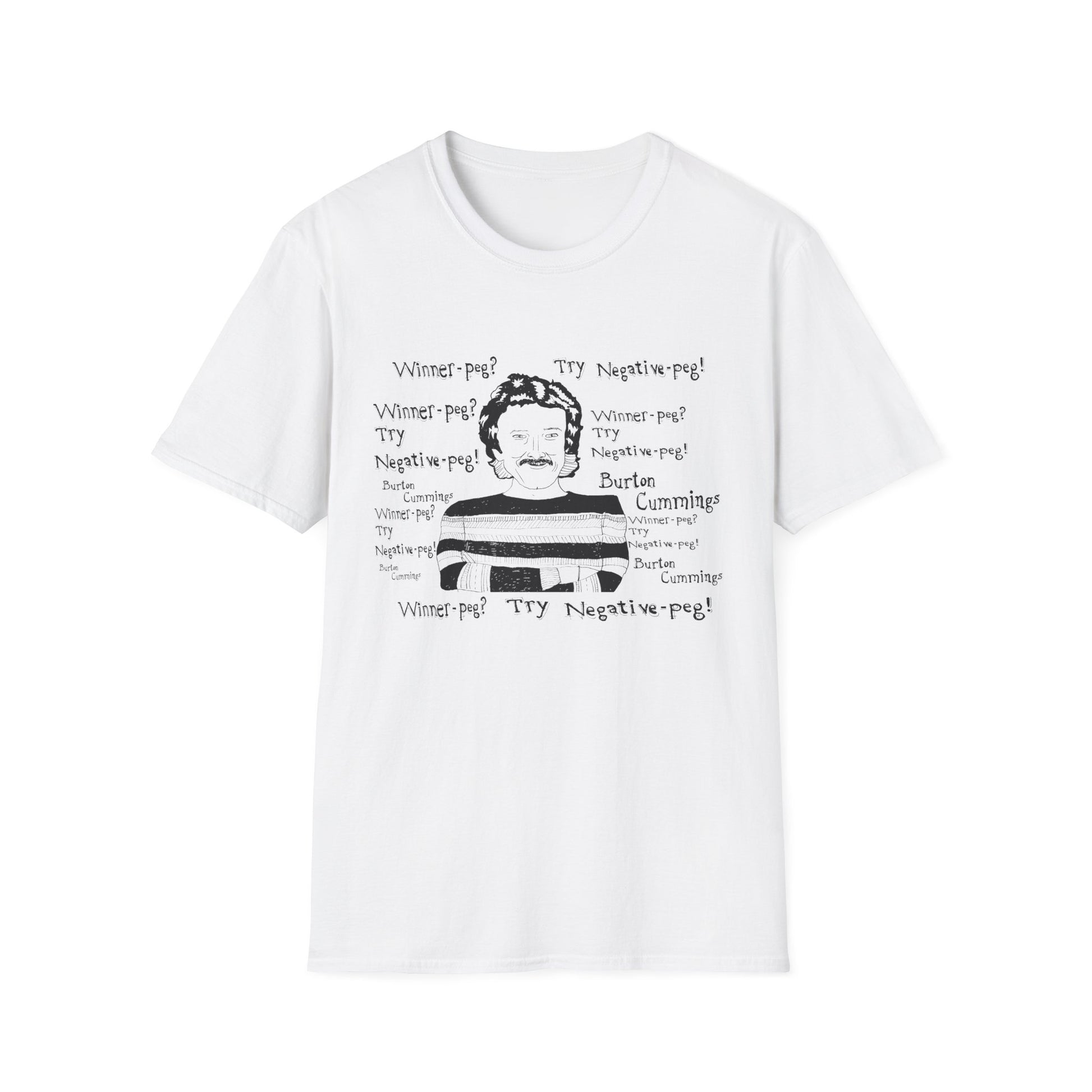 original fan art drawing of burton cummings talking about winnpeg tshirt i guess in 1985 burton cummings was hit with a beer bottle at a 7-11. when asked about the incident, he may have said "winner-peg? try negative-peg!"