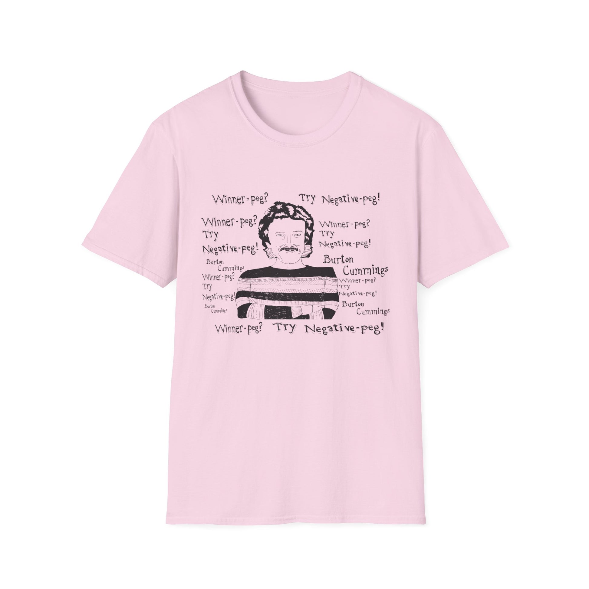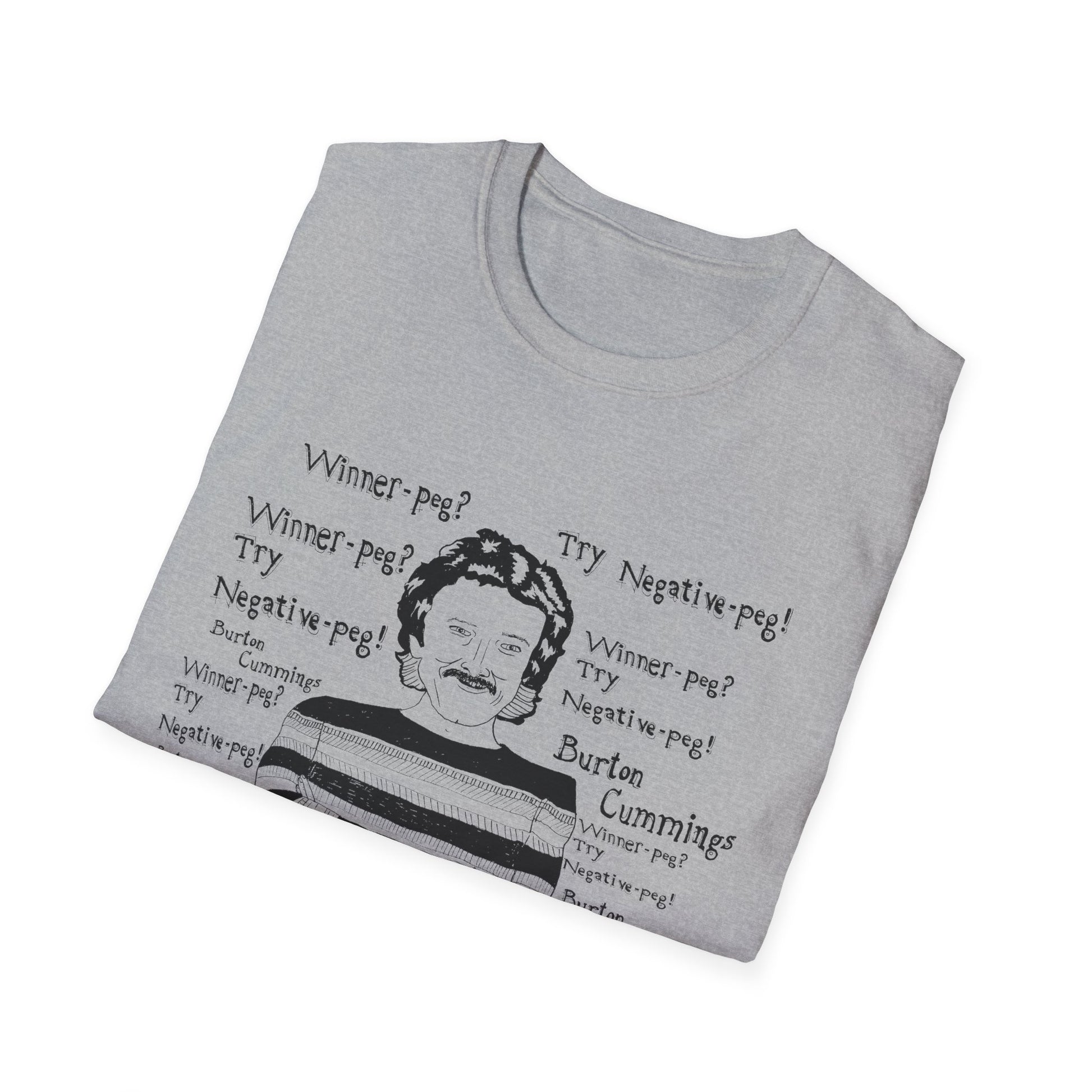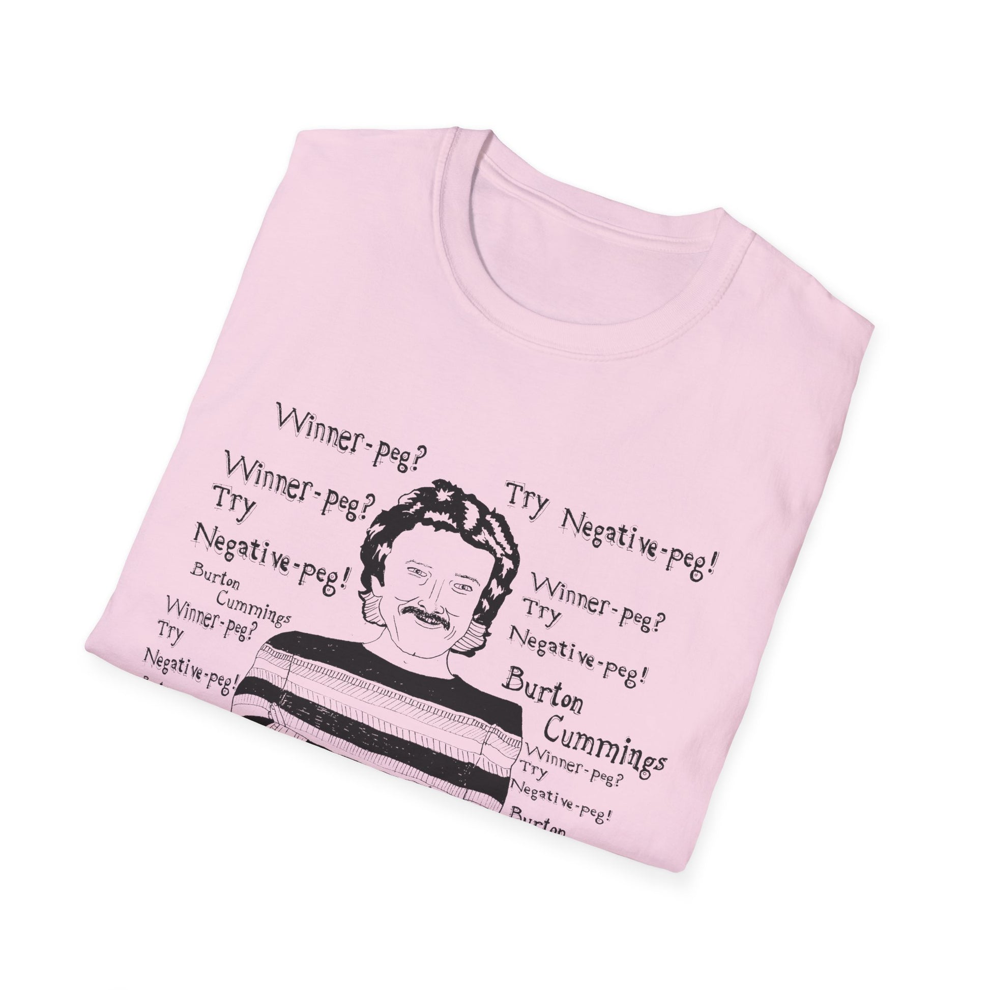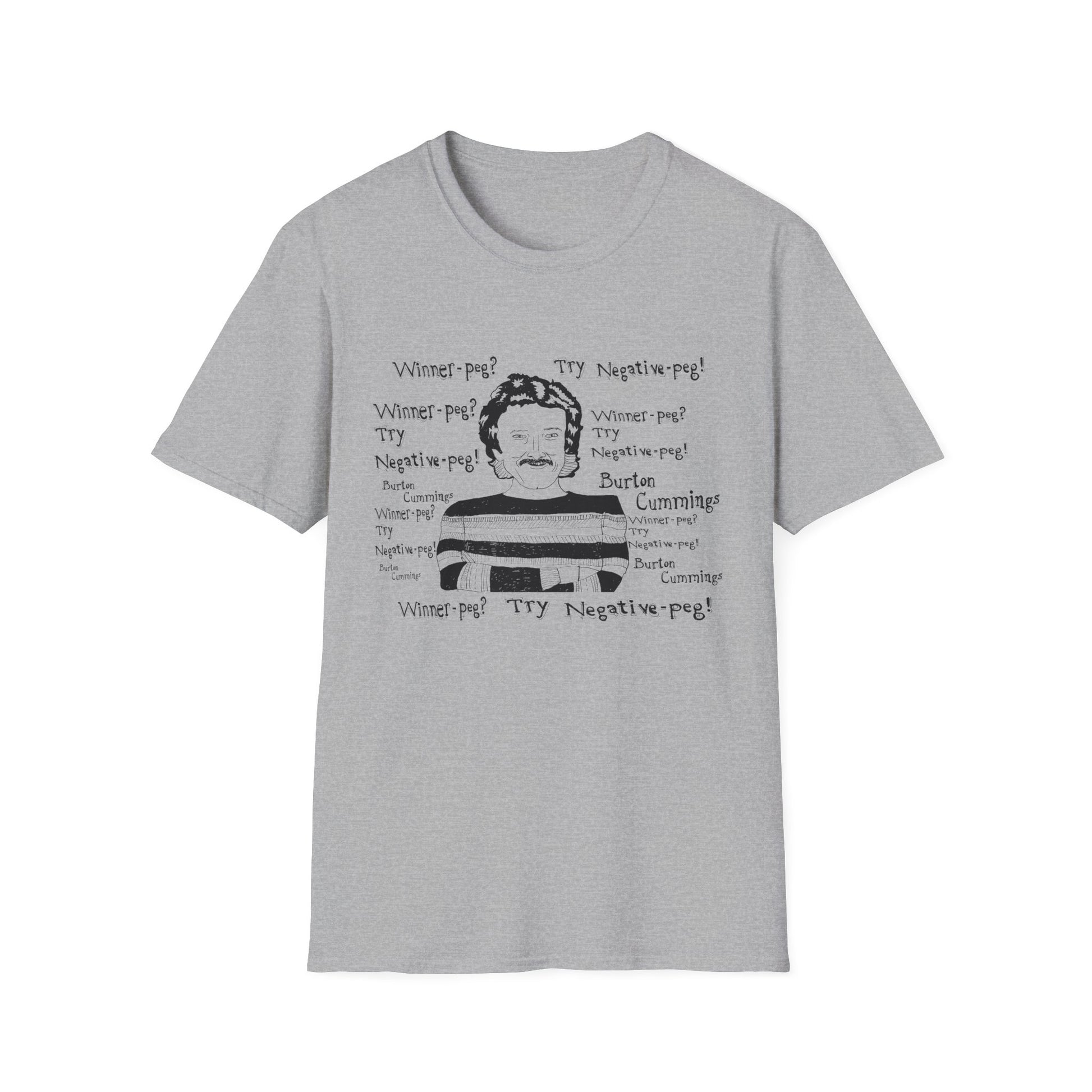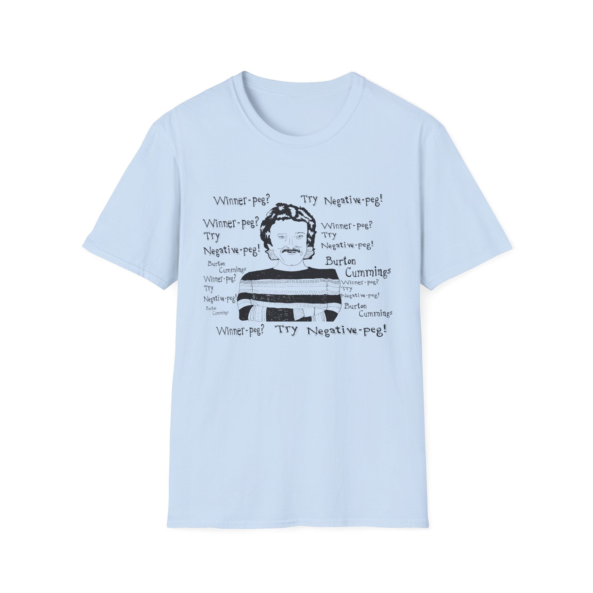original fan art drawing of burton cummings talking about winnpeg tshirt i guess in 1985 burton cummings was hit with a beer bottle at a 7-11. when asked about the incident, he may have said "winner-peg? try negative-peg!"