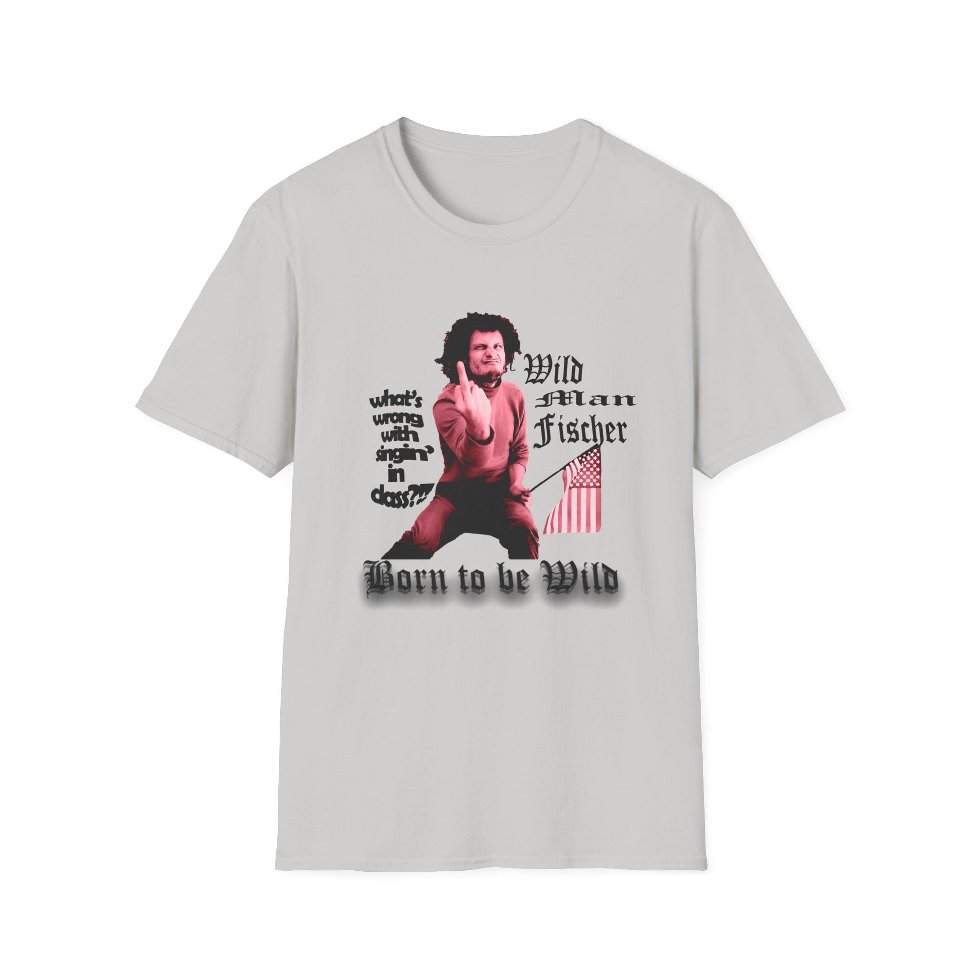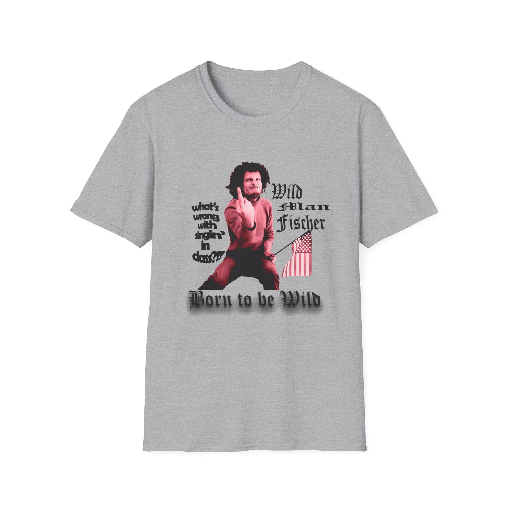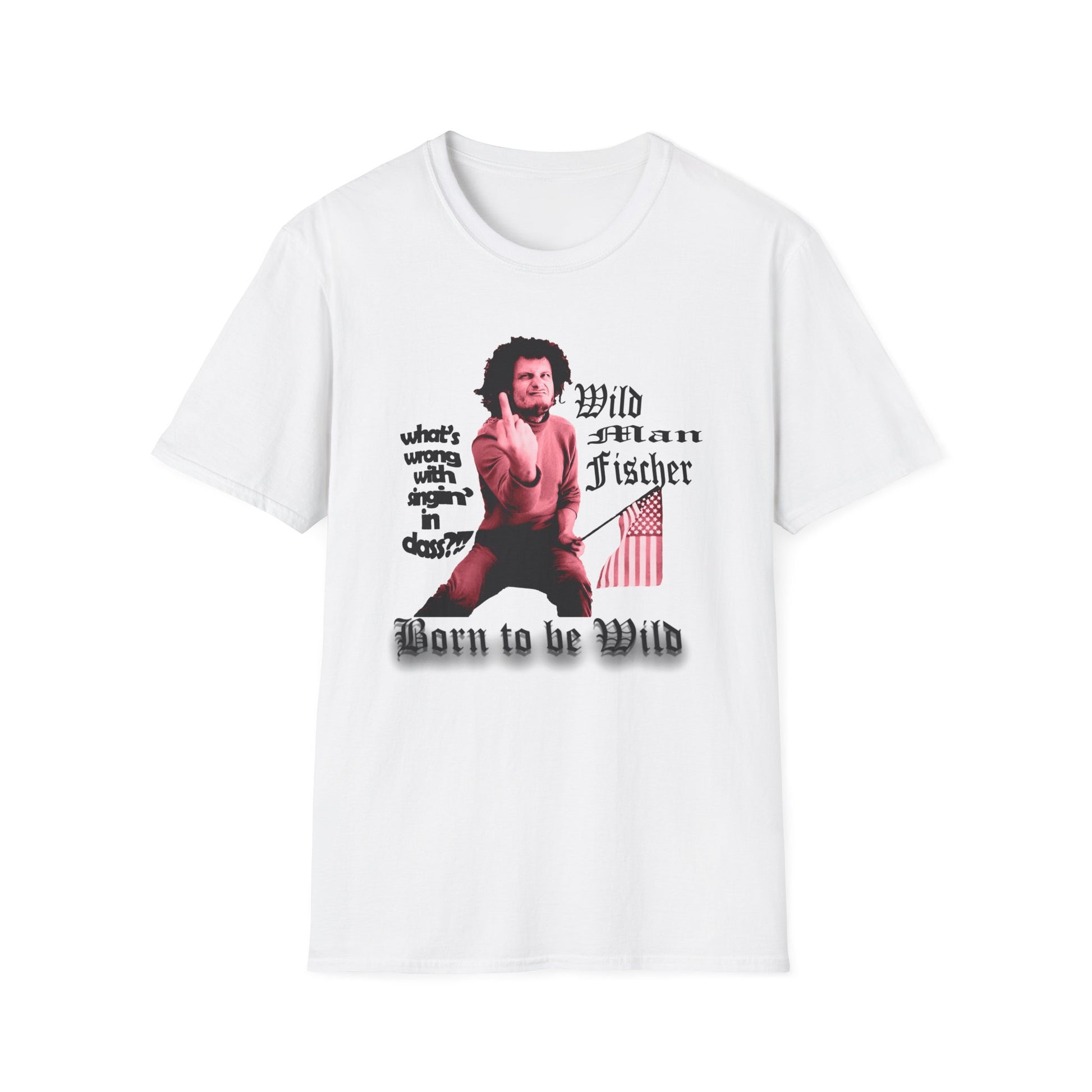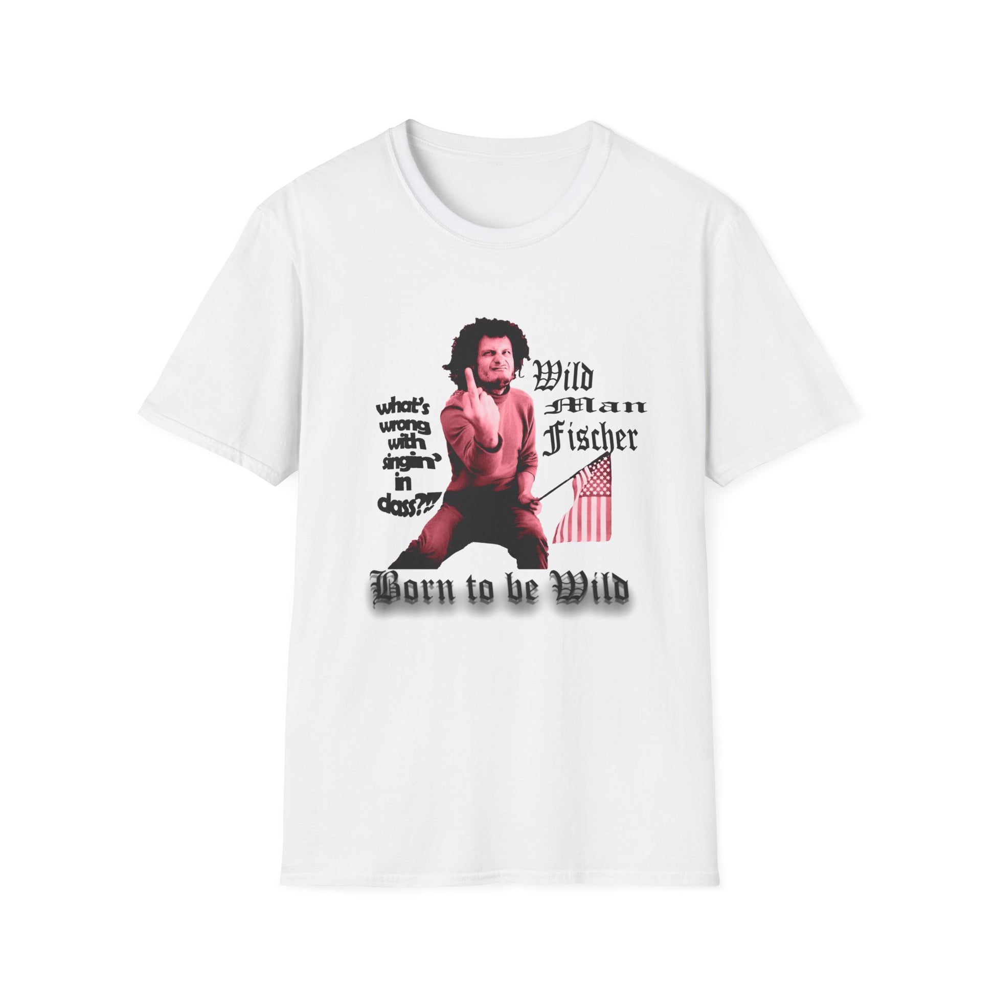 wild man fischer middle finger in red tshirt